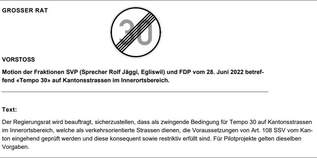 Der Regierungsrat wird beauftragt, sicherzustellen, dass als zwingende Bedingung für Tempo 30 auf Kantonsstrassen im Innerortsbereich, welche als verkehrsorientierte Strassen dienen, die Voraussetzungen von Art. 108 SSV vom Kanton eingehend geprüft werden und diese konsequent sowie restriktiv erfüllt sind. Für Pilotprojekte gelten dieselben Vorgaben.